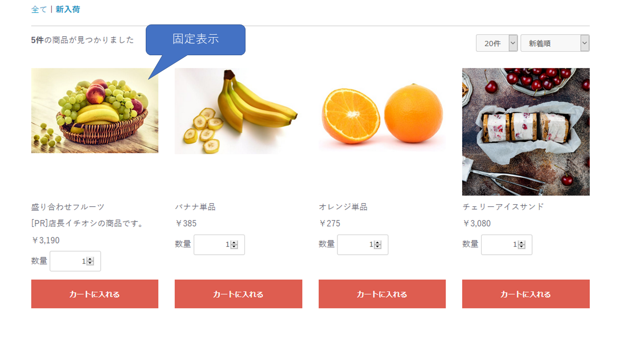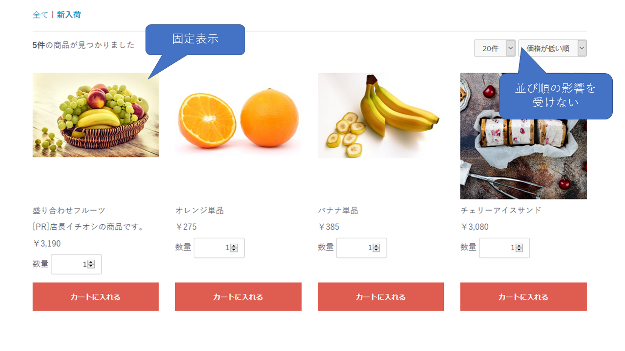 これにより、商品一覧のTOPに固定する商品が複数ある場合に任意の順番にて固定表示することが可能です。