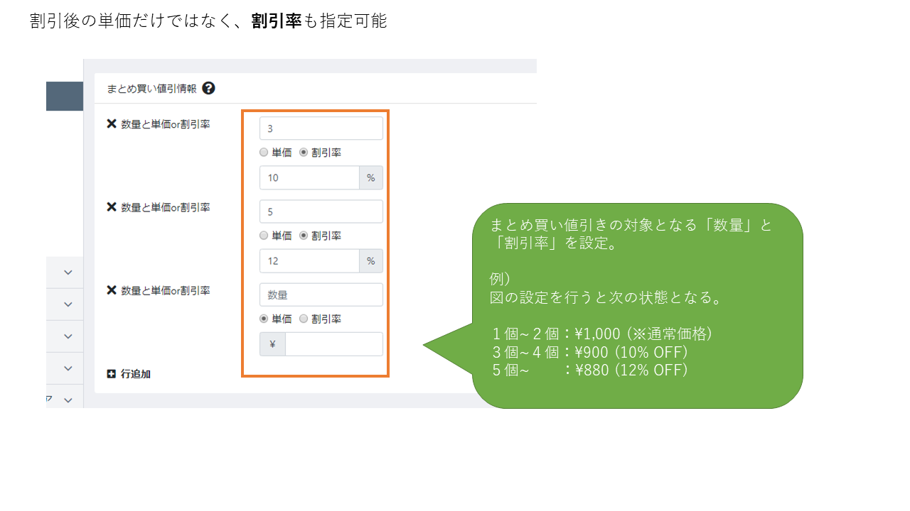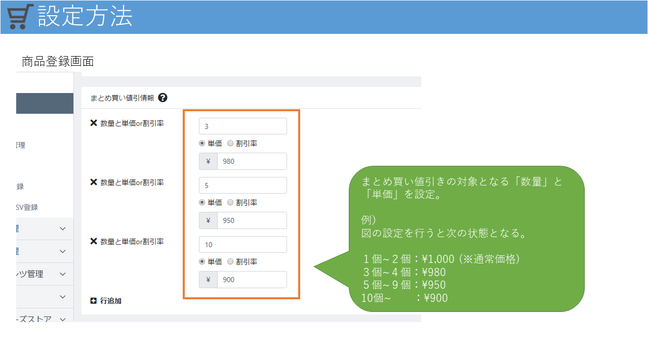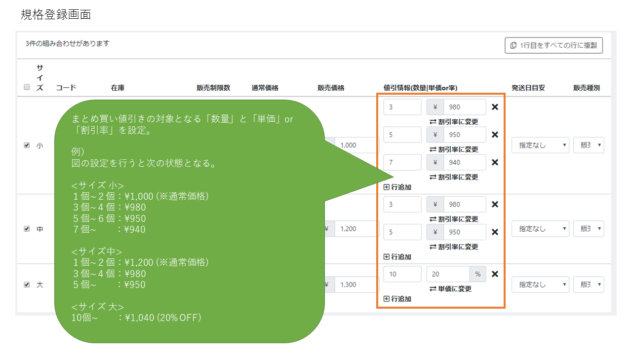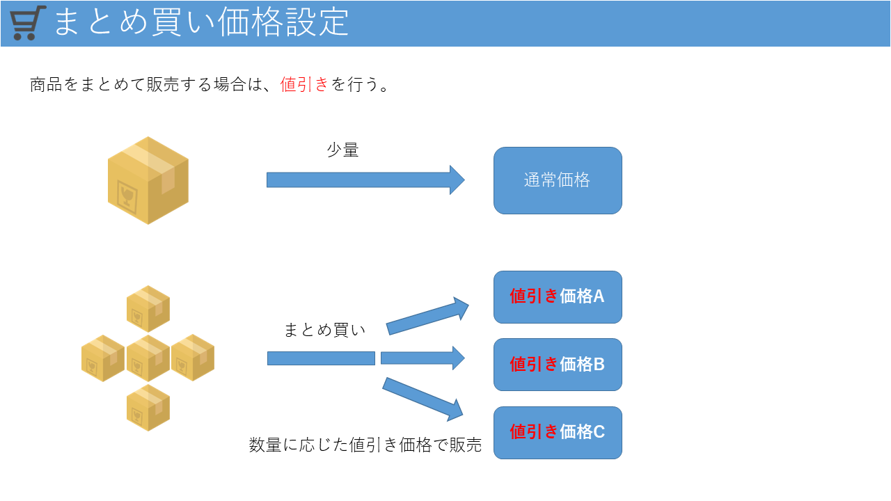 販売する商品の特性上、大量に購入してもらえる場合は、少量で販売する場合よりも価格を下げて販売するといったことを行いたいということがあるかと思います。