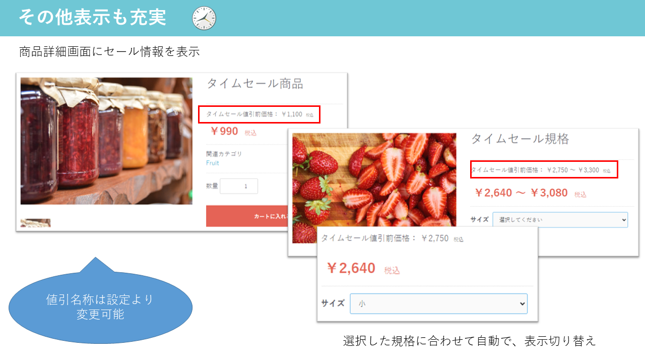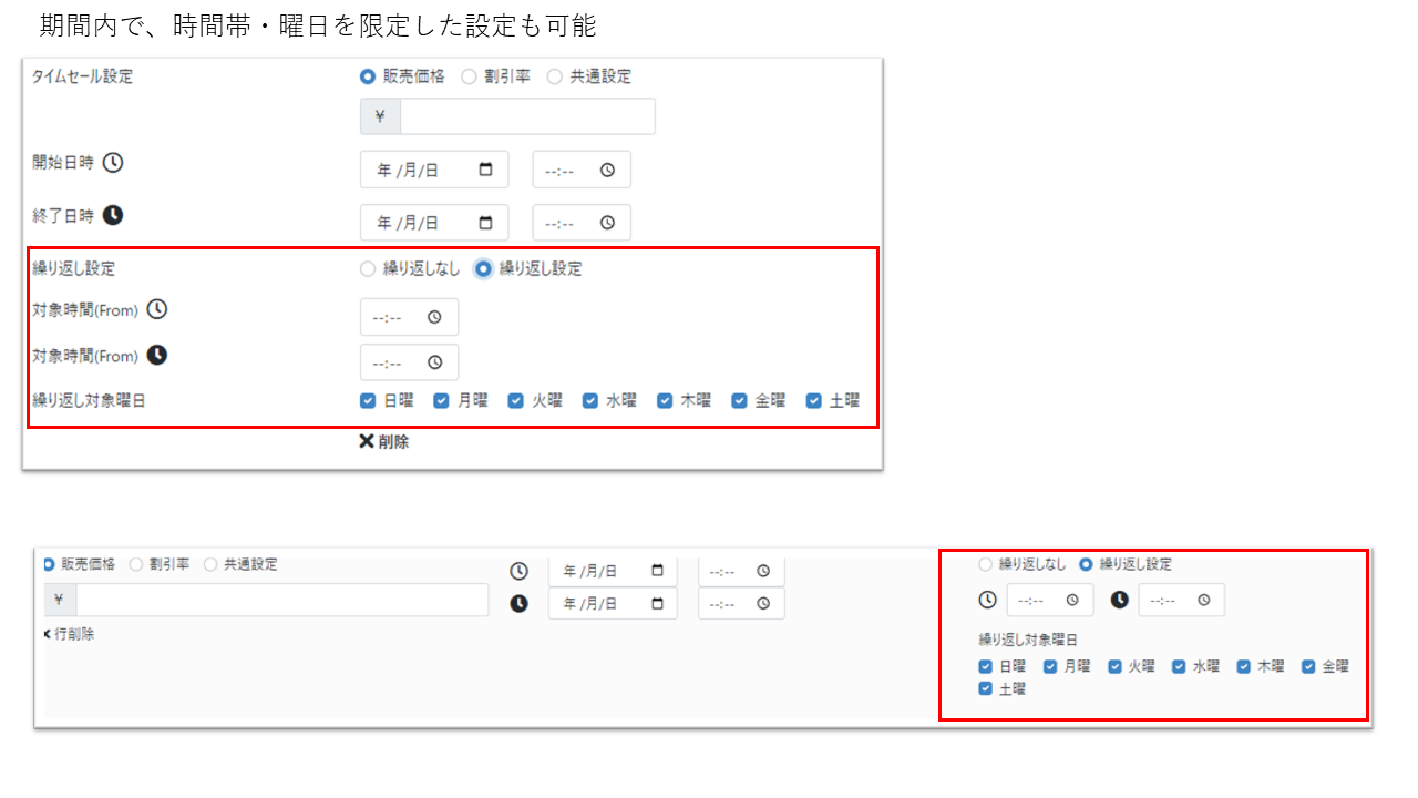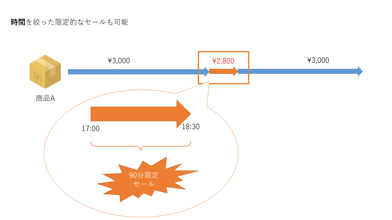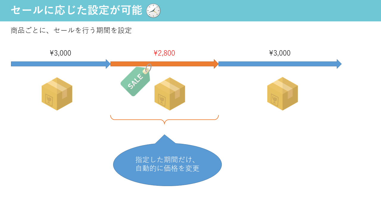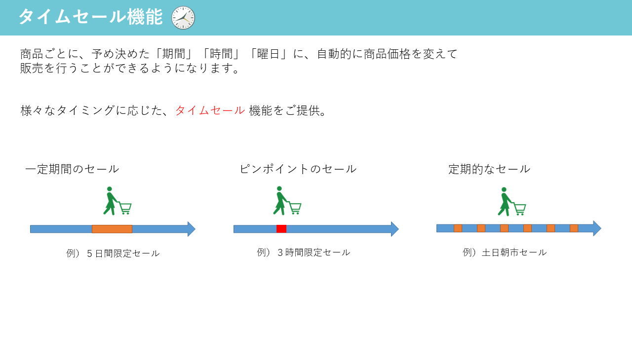 商品ごとに、任意の「期間」「時間」「曜日」に自動的に商品価格を変えて販売(タイムセール)を行うことができるようになります。