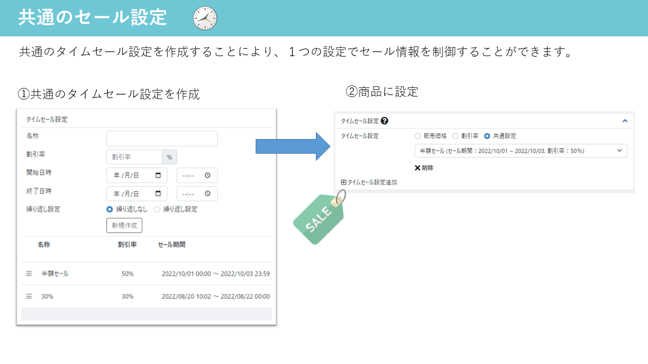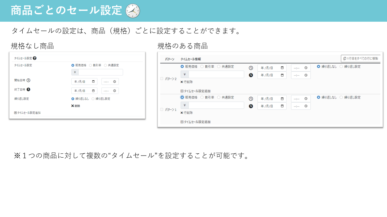 商品ごとに、任意のタイムセール情報の設定、共通設定として用意したタイムセール情報を設定することができます。