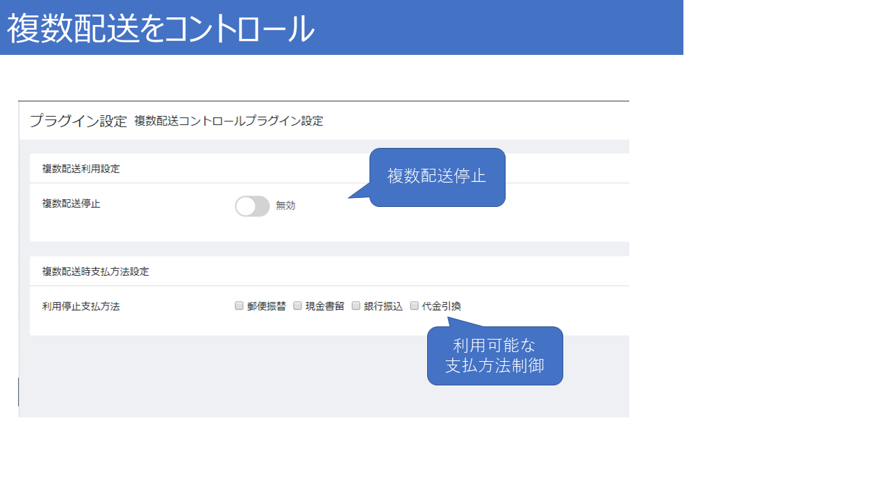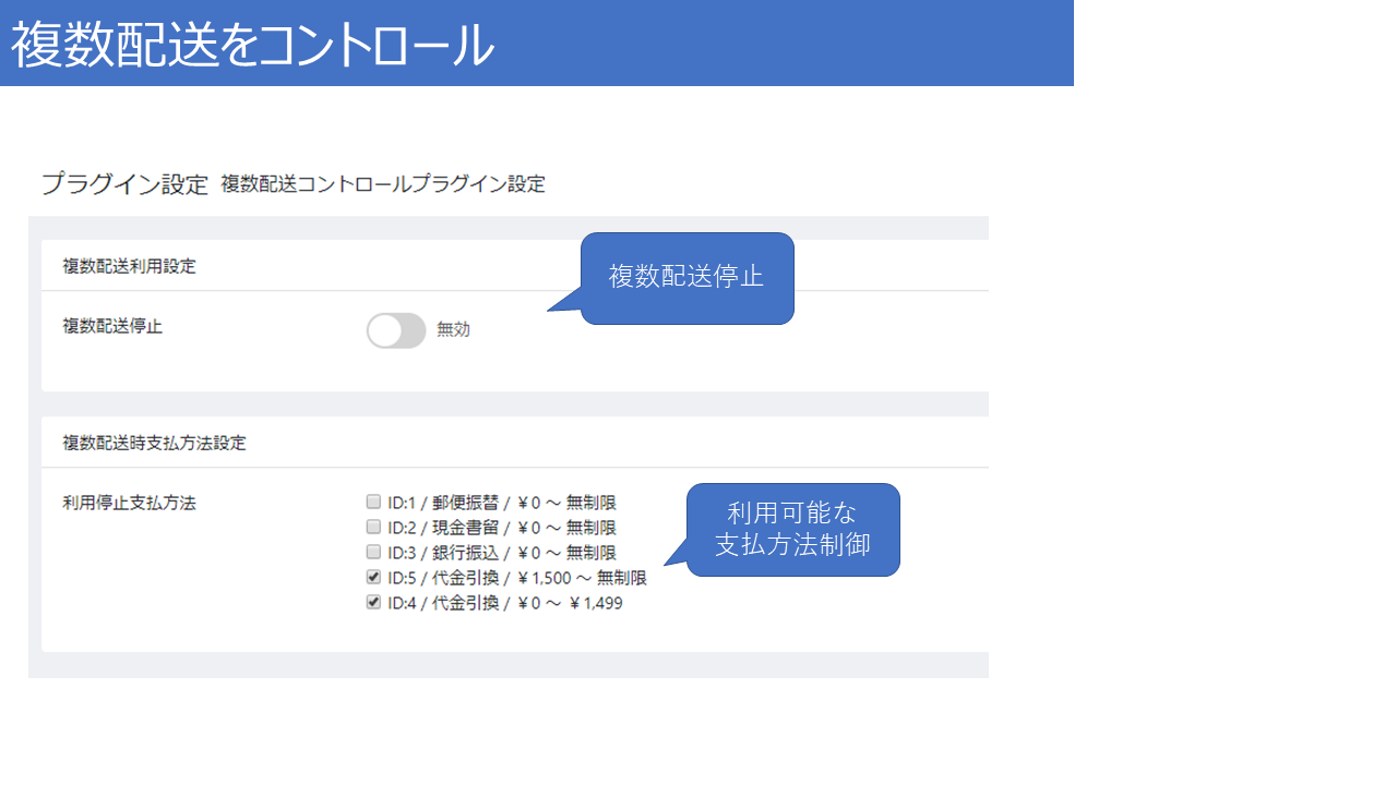 このプラグインを利用すれば、複数配送時のみ利用させてくない支払方法を設定することができます。