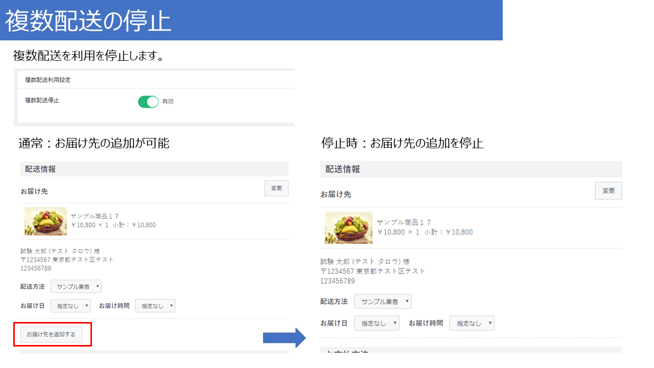 複数配送利用設定にある、「複数配送停止」を有効にすると複数配送が停止され、お届け先の追加が行えなくなります。